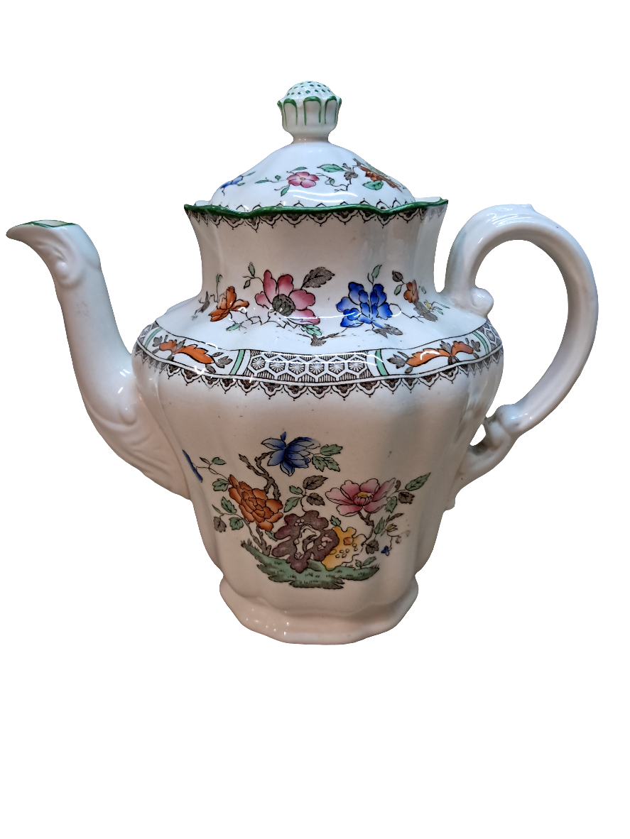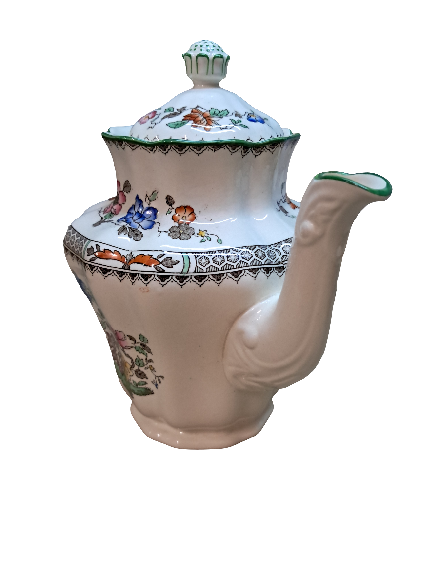 - The most beautifully molded, and decorated Copeland Spode Chinese Rose. This exquisite pattern features an elegant, vibrant flowers and a geometric pattern that sets it off nicely. It is edged in rich green. This coffee pot is truly a work of art and would be a wonderful addition to a set or to a collector who just loves beautiful things!