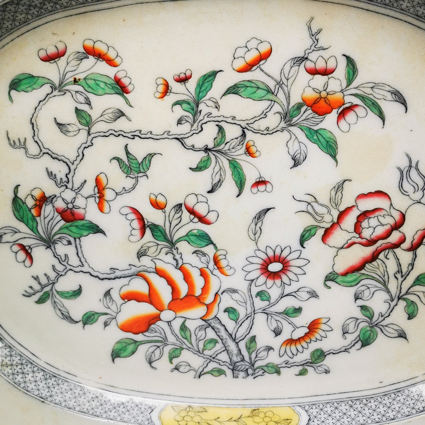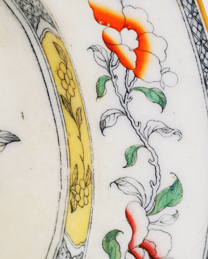 - Early English shape with full hand coloured Peony tree design with rare yellow inner rim infill