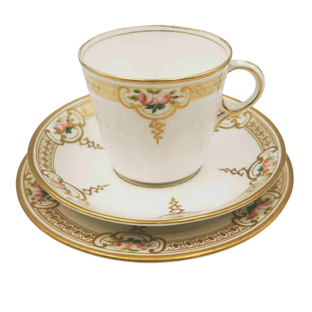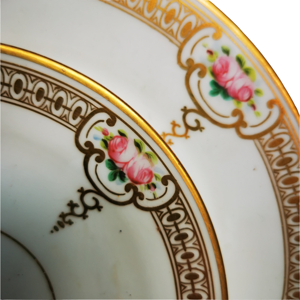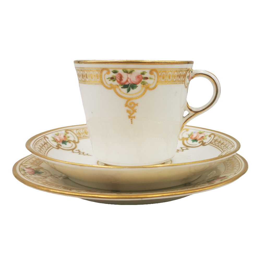 Antique Rose Bud Floral Porcelain and Gilt China Hand Decorated Teacup Saucer and Side Plate