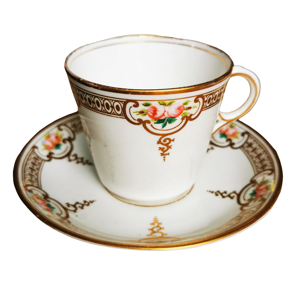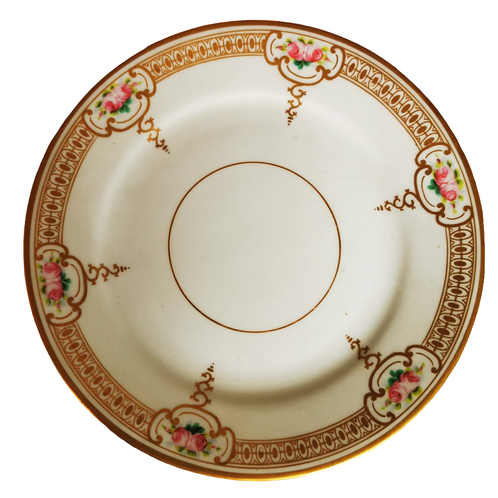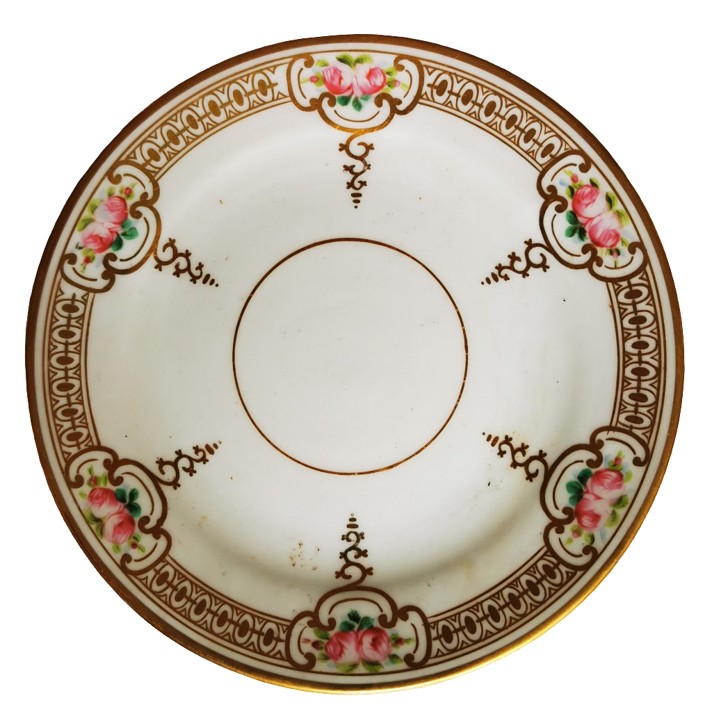 Antique Rose Bud Floral Porcelain and Gilt China Hand Decorated Teacup Saucer and Side Plate