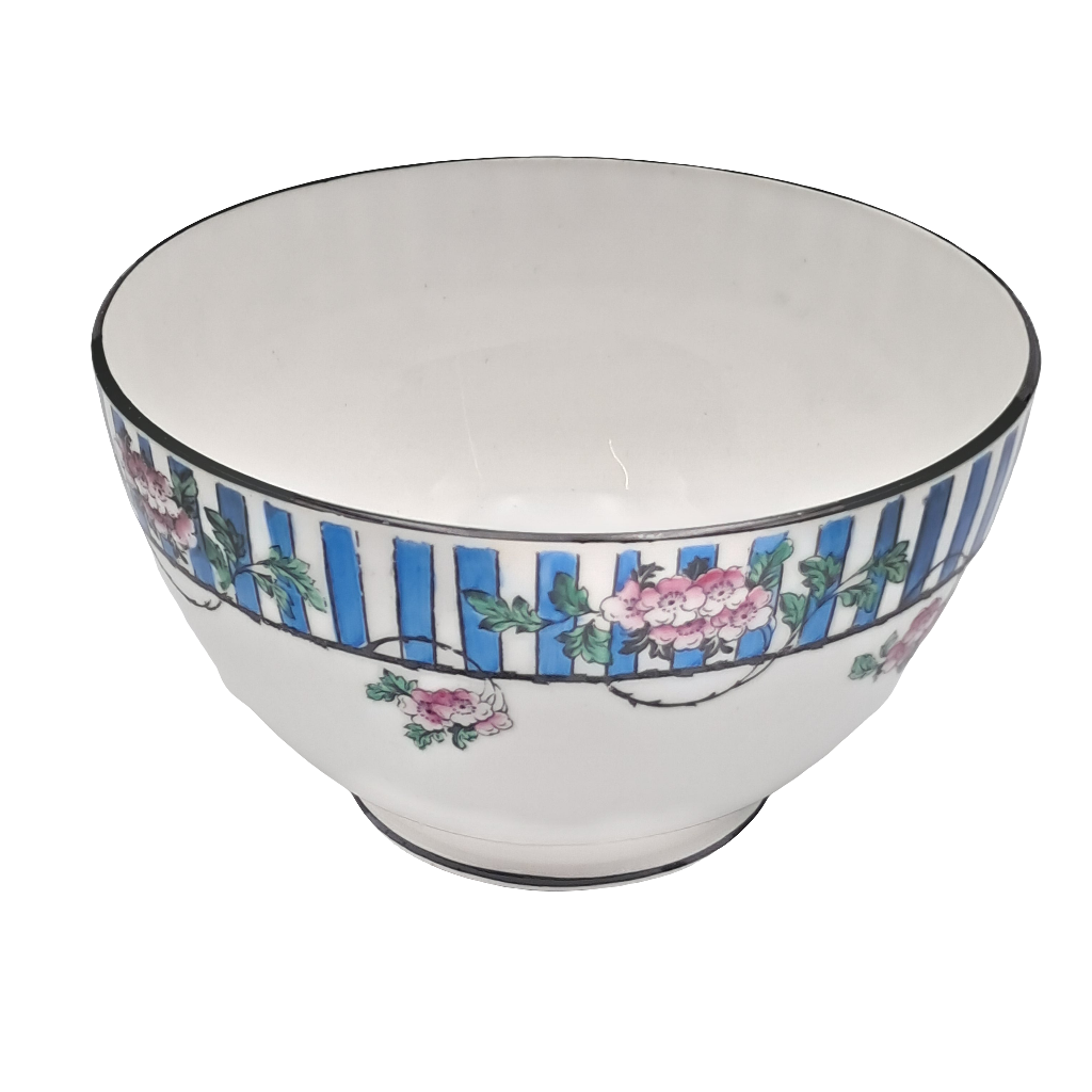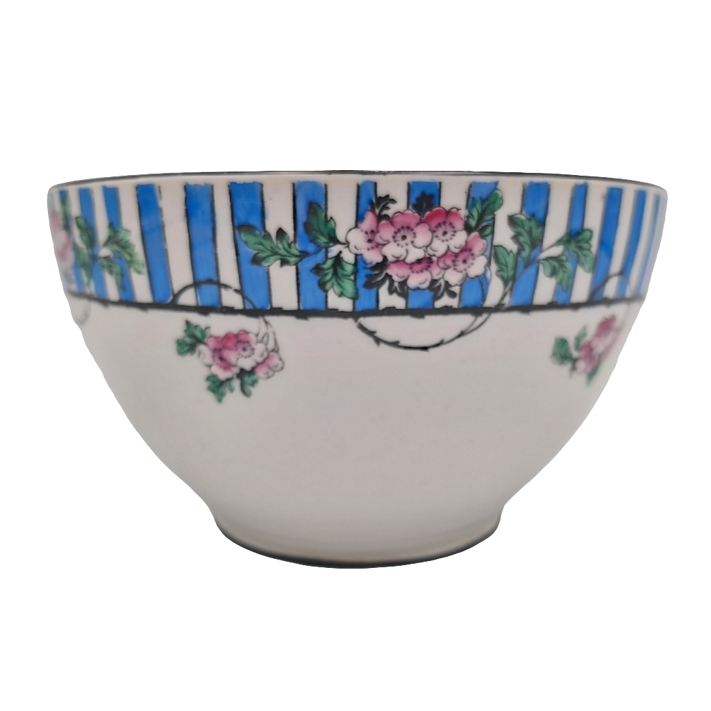 - This large sugar bowl is white thin black lines around the top and bottom rims, with a decorative border of blue and white stripes and finished with pink flowers with green leaves for a beautiful touch of colour.