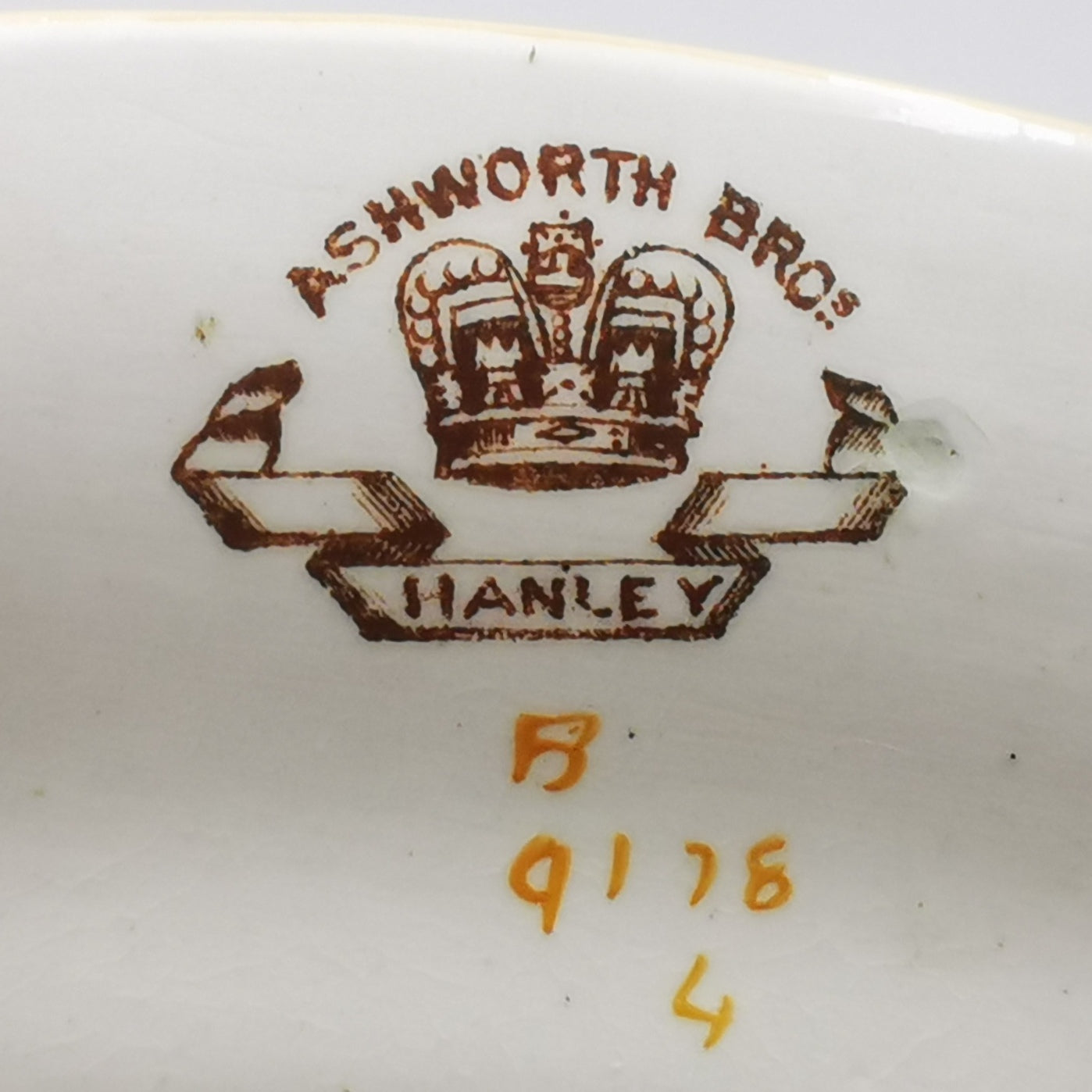 - This early piece has Ashworth printed crown and banner marks hand applied B9178 decorators marks