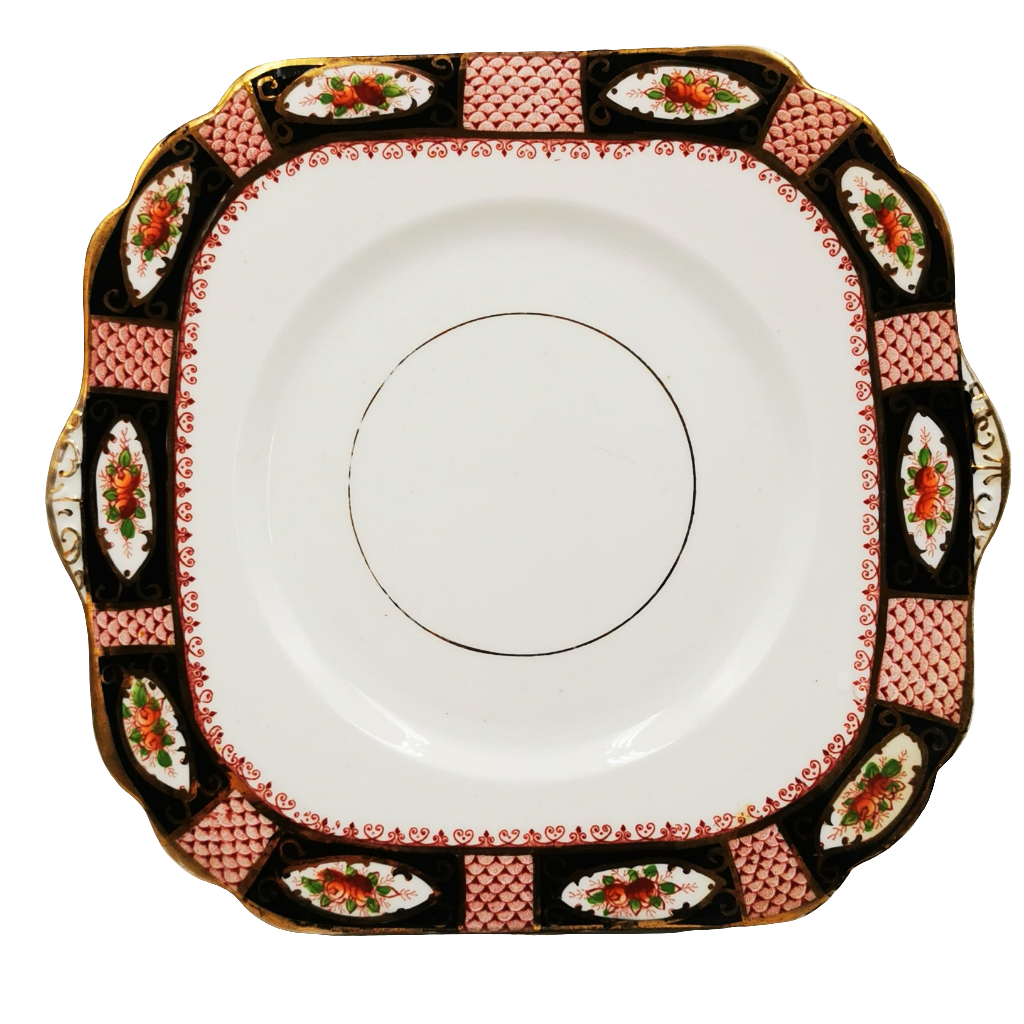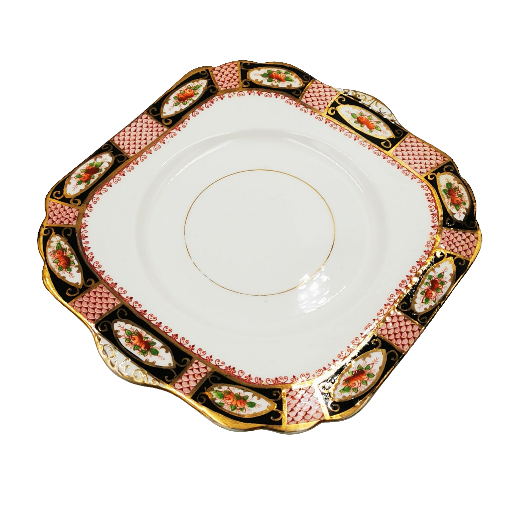 - Hand coloured twin rose bud bouquet with heavy gilt and cobalt blocks divided by pink fish scale block design in the imari style