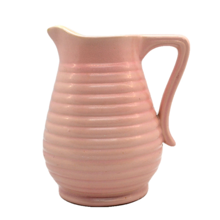 - Very pretty 1950s vintage pink milk jug with a ribbed design and an angular handle