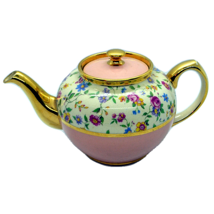 - lovely floral garlands on upper half with pastel pink lid and lower half of teapot with broad gilt bands spout handle and lid. A very pretty example of sadler vintage teapot design.