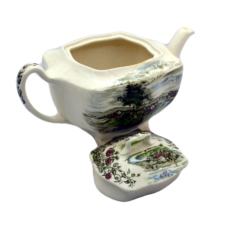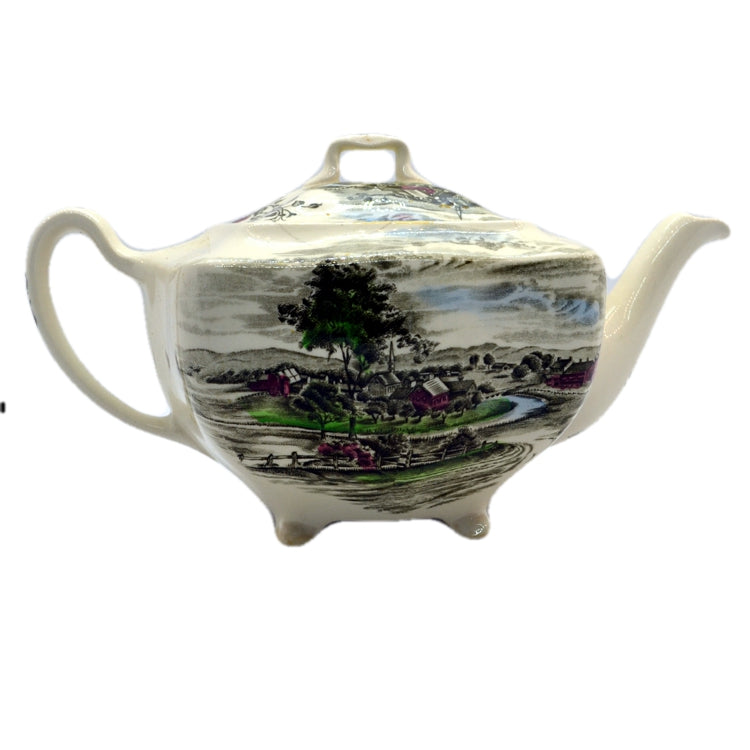 - 2 pint rare rectangular large vintage teapot showing "The Road Home" scene