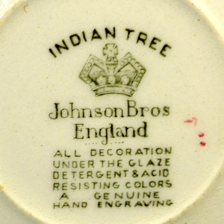 - Johnson Brothers England crown factory marks with detergent and acid-resisting colours date these Indian tree plates to the 1960s