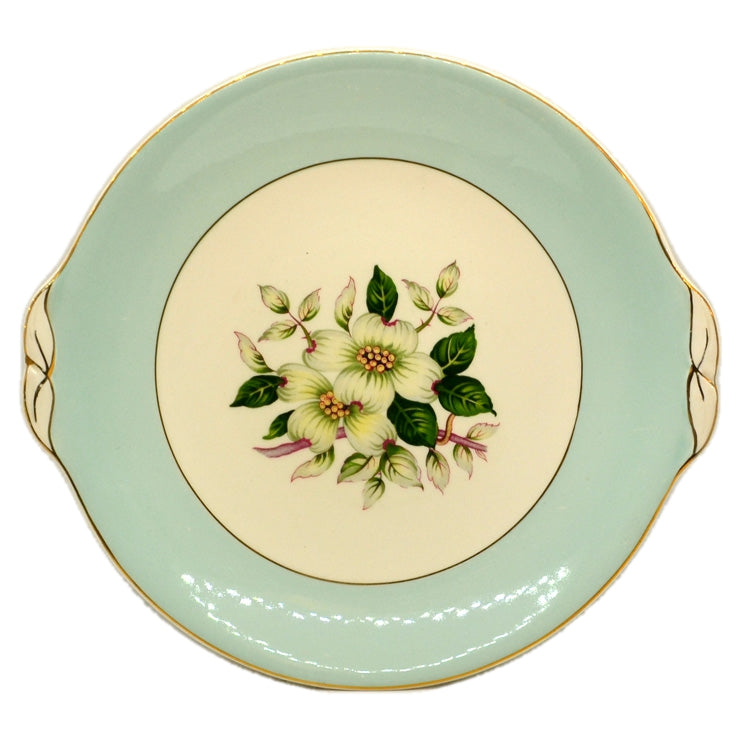 - 9.75-inch round vintage cake plate extending to 10.5-inches between the handles.