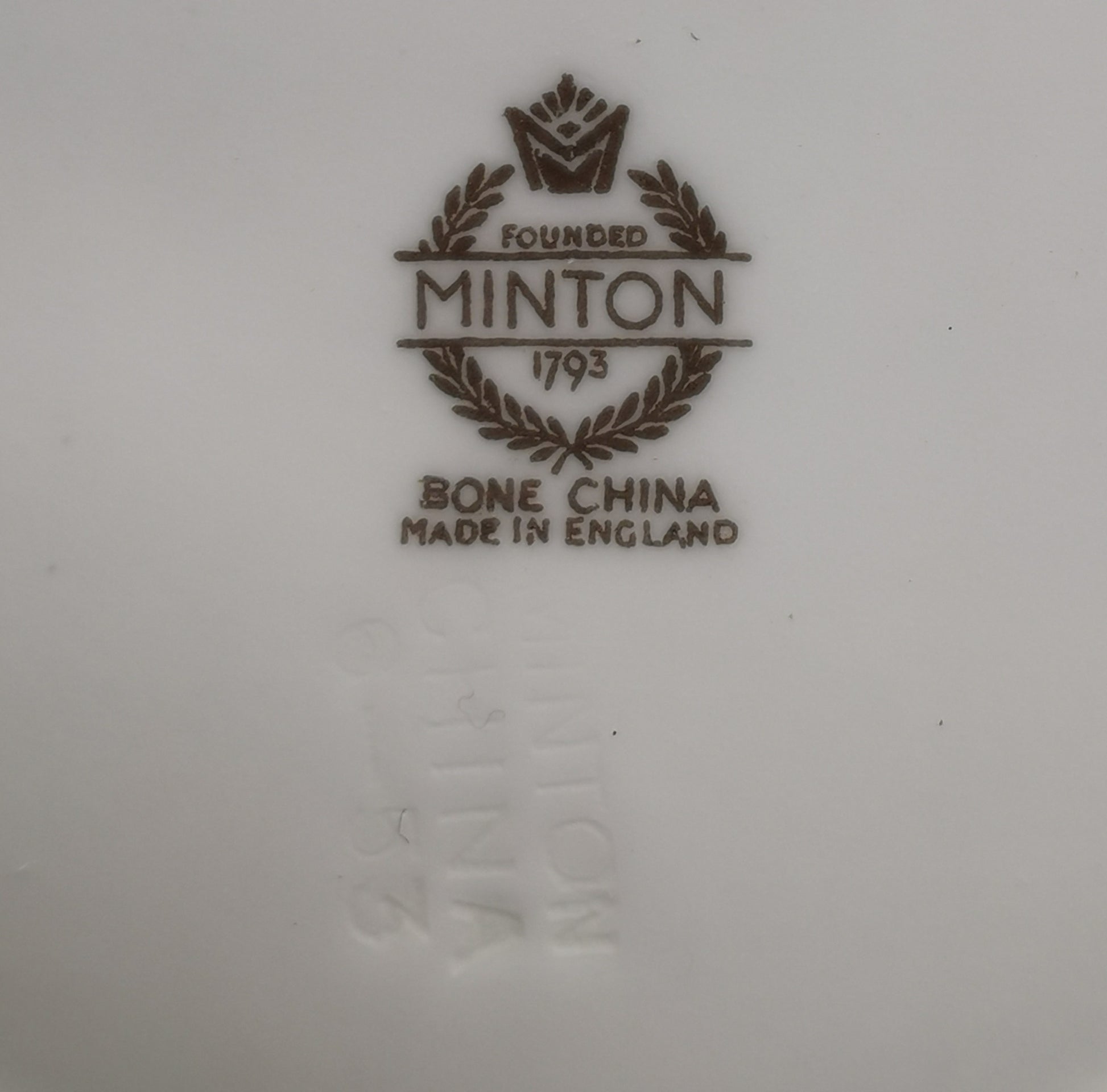 - Fine Minton bone china in a pale mint green with floral bouquet and gilt detailing
