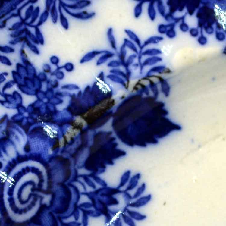 - Condition note. there is s small chip on one of the ribs on the plate surface. There is also an area of glaze ware to a 1-inch segment of the inner rim. There is a stable antique crack only apparent on the underside of the plate extending inwards approx 1.5-inch. There is some nibbling to the rims. There is micro-crazing on the front glaze.