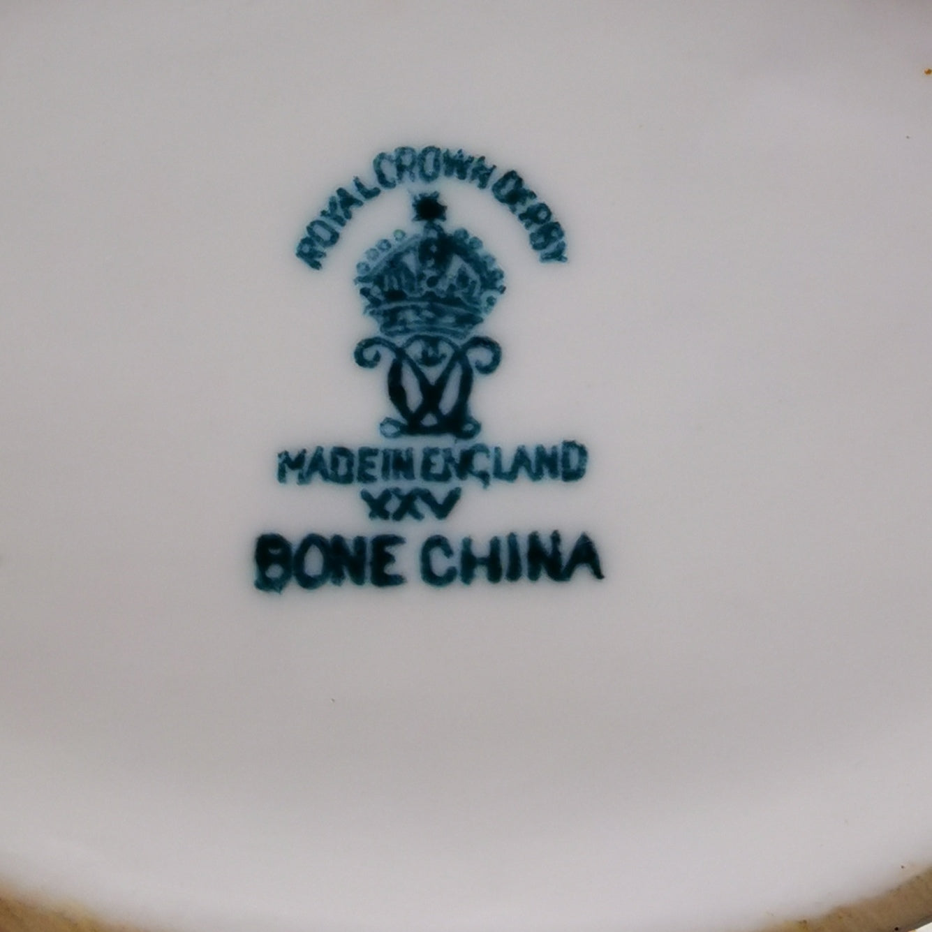 - Green Royal Crown Derby English Bone China XXV factory marks on both pieces