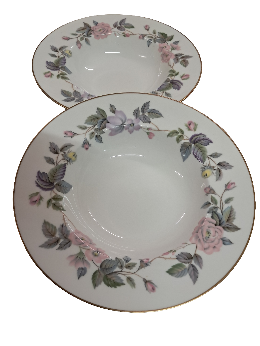 - Beautiful lilac and pale pink flowers with green leaves that also have a hint of lilac on them. This piece has a beautiful gilt edging