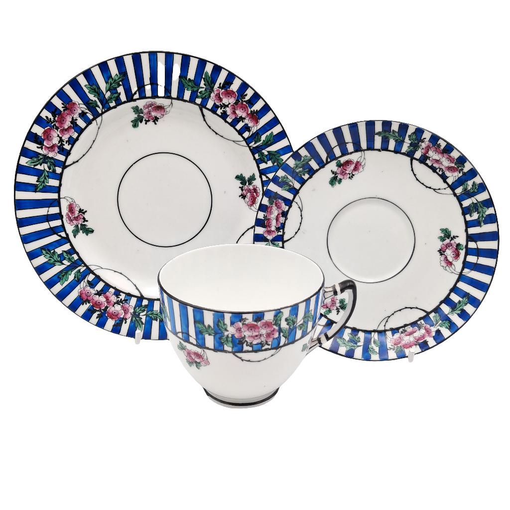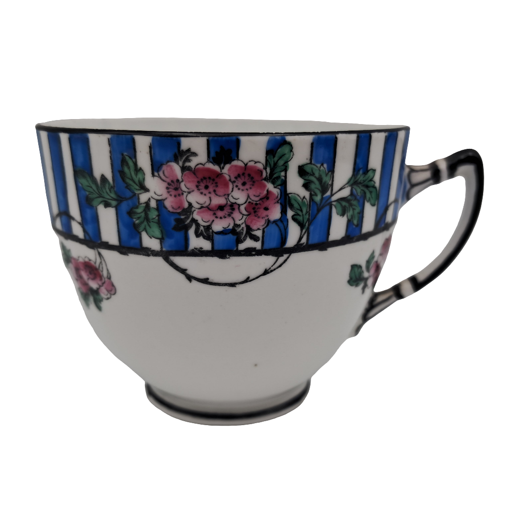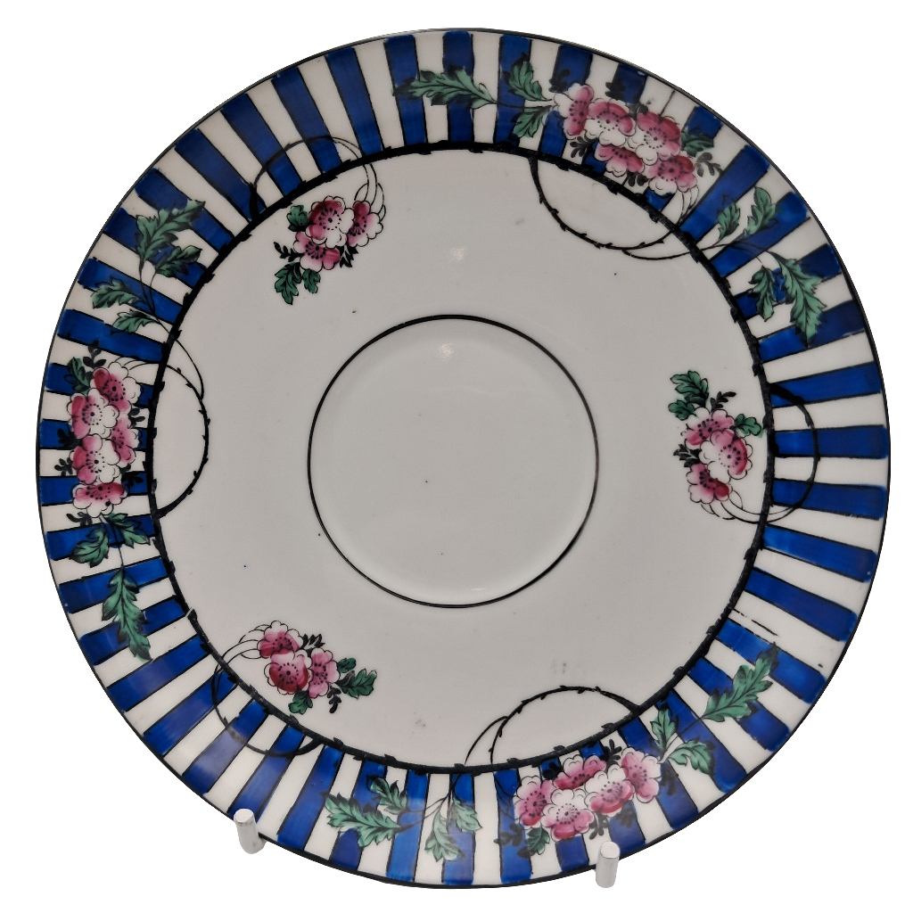 - The side plate and saucer have a white centre thin black lines around the inner and outer rims, with a decorative border of blue and white stripes and finished with pink flowers with green leaves for a beautiful touch of colour. The cup reflects this pattern with a white base, black lines around the bottom and top edges, blue and white stripes around the top, finished off with pink flowers and green leaves. The handle is black and white. It really is an attractive design.