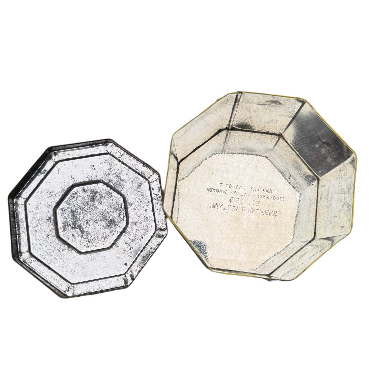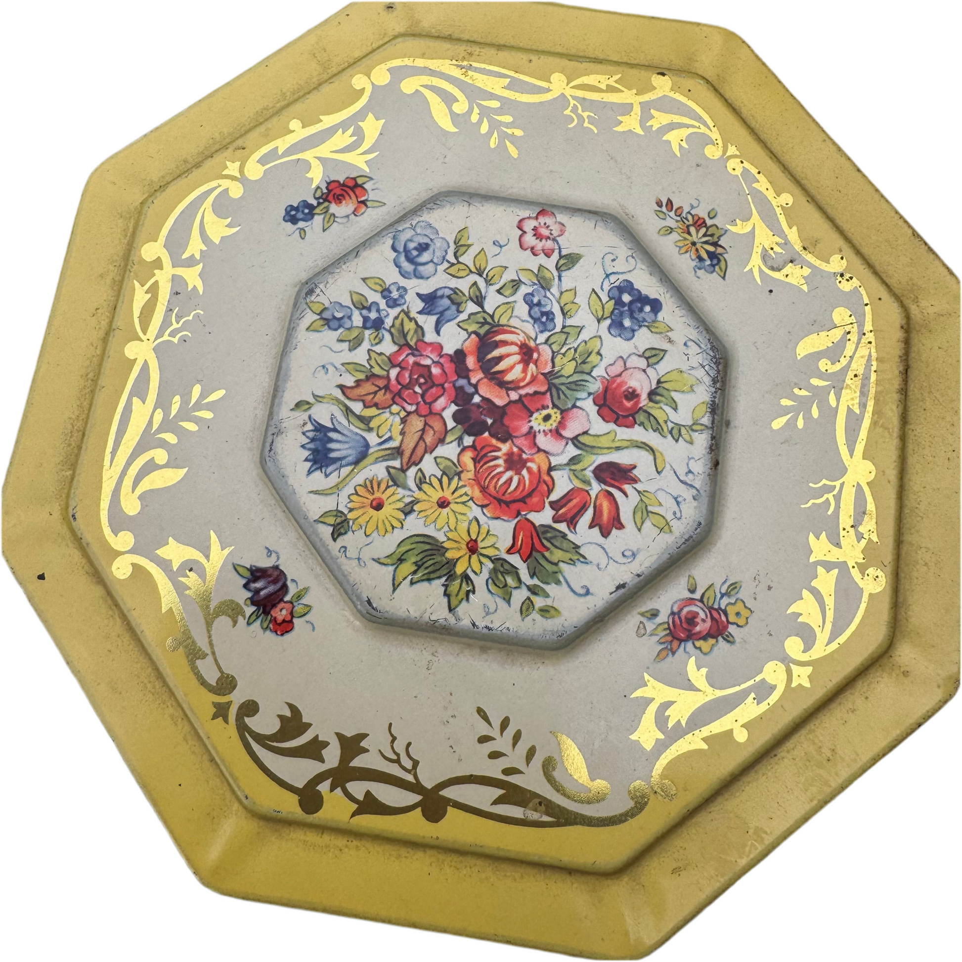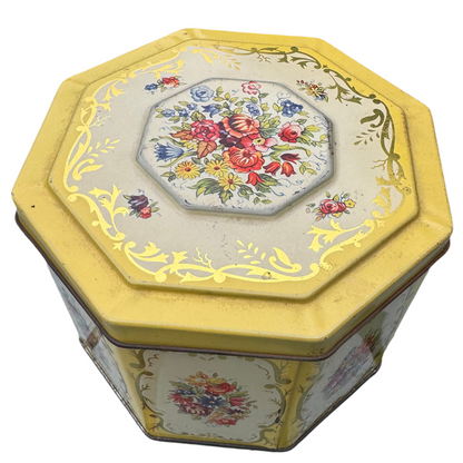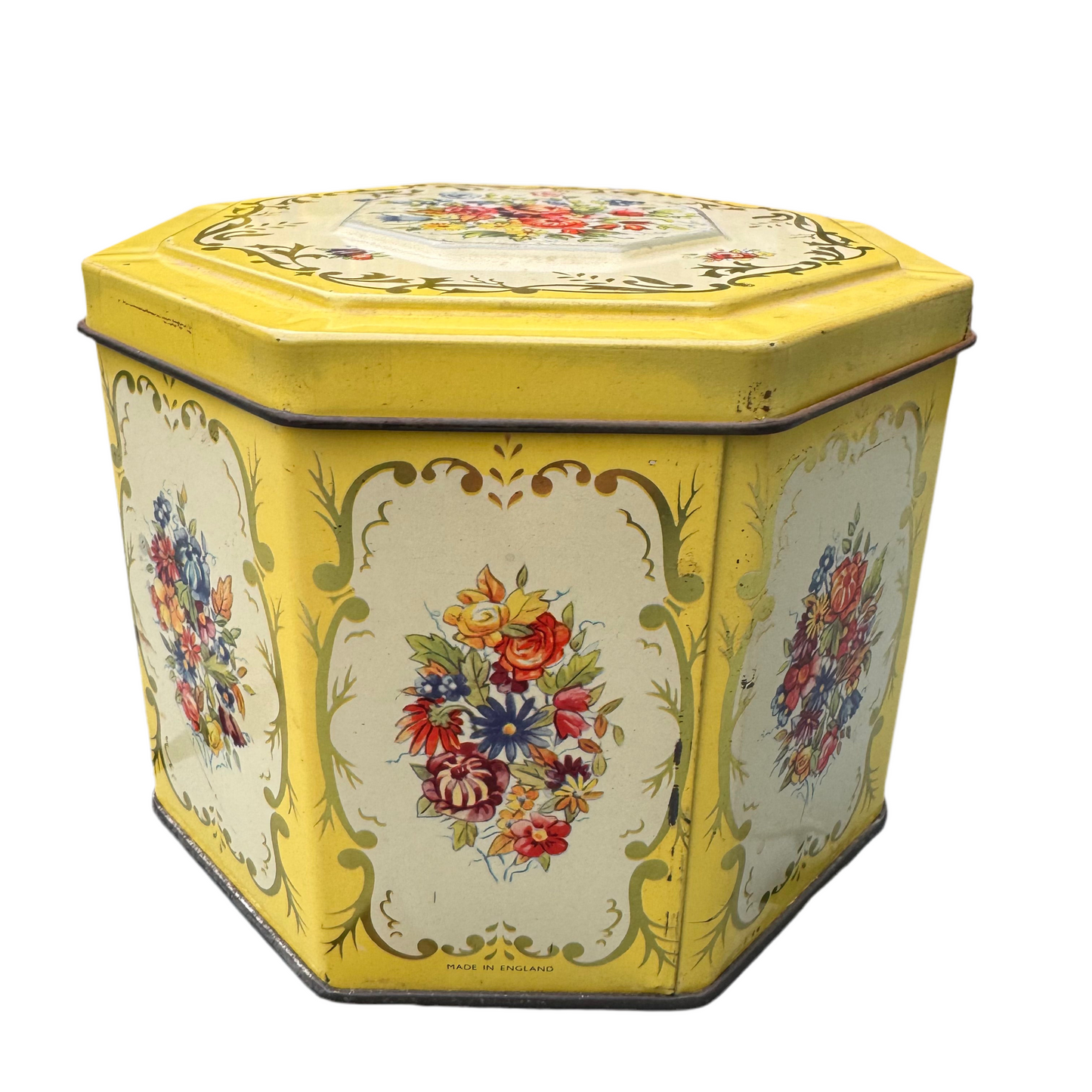 Vintage octagonal shaped Huntley & Palmers biscuit tin with original lid soft yellow floral colour