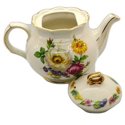 - lovely floral garlands on both front and rear with broad gilt bands spout handle and lid. A very pretty example of sadler vintage teapot design.