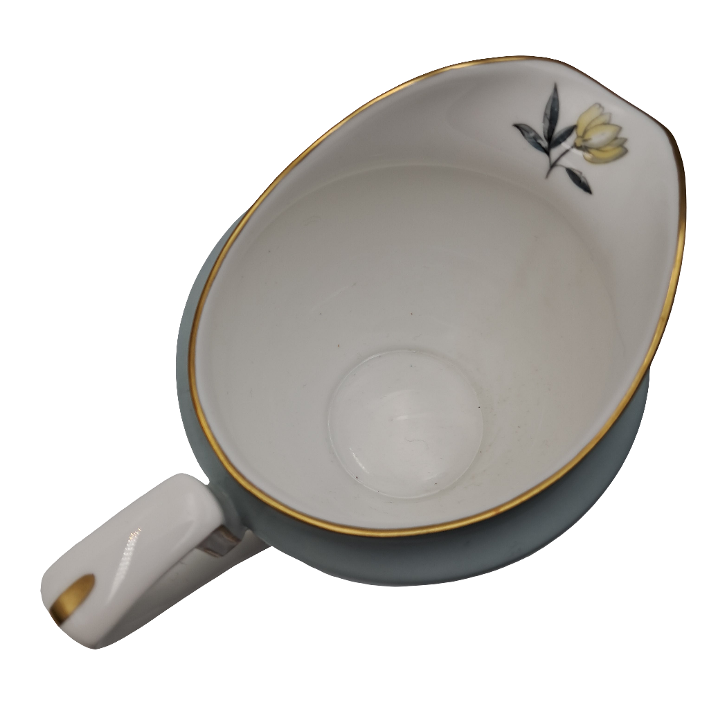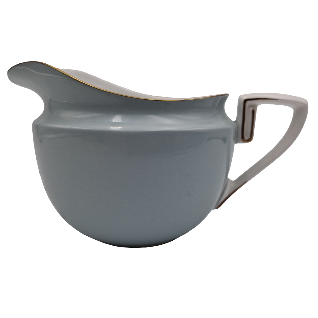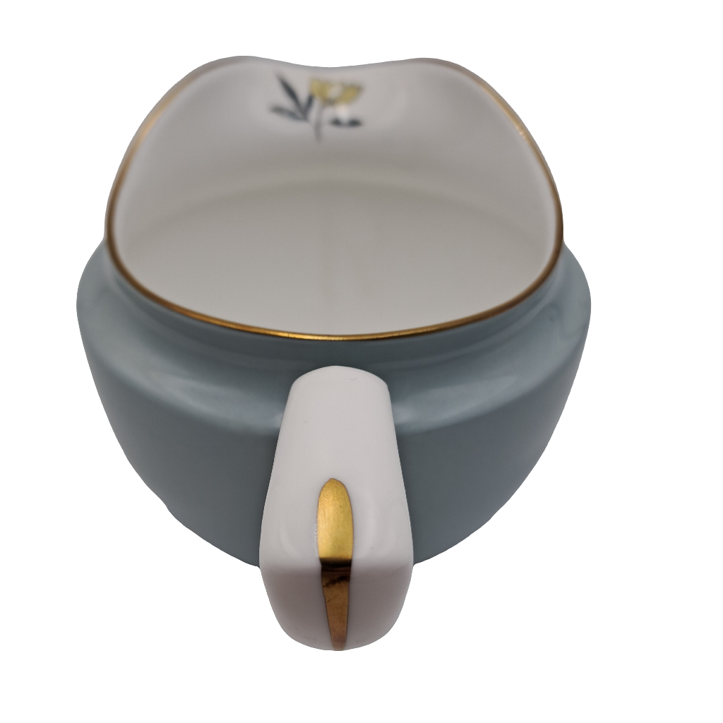 - The jug has a a pale blue exterior with a gilt rim around the top and bottom. The inside is white with a single yellow flower with blue-grey leaves.